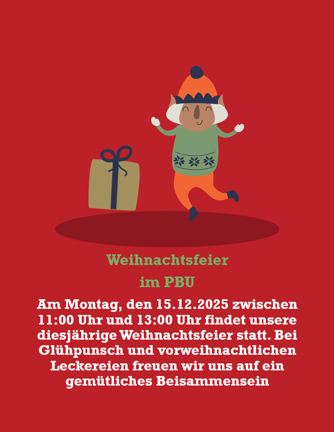 Am Montag, den 15.12.2025 zwischen 11:00 Uhr und 13:00 Uhr findet unsere diesjährige Weihnachtsfeier statt. Bei Glühpunsch und vorweihnachtlichen Leckereien freuen wir uns auf ein gemütliches Beisammensein.
